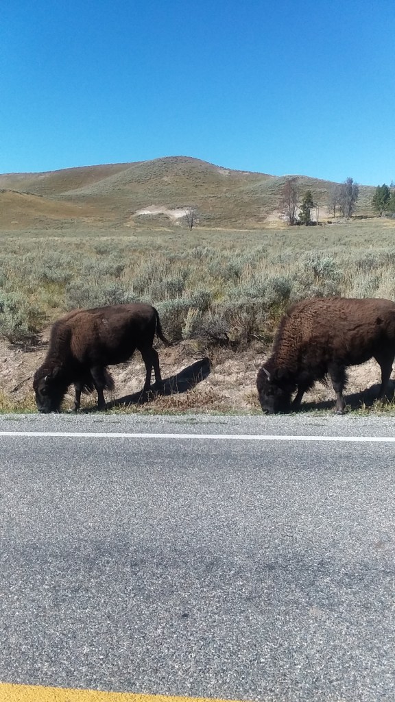 I went to Yellowstone once when I was 12. It was the last family vacation before my parents divorced. I didn’t remember much about it but I’ve always wanted to go again. My son was 11 when I took him. We spent a total of 6 days on the road and in the park. We camped in a tent in a few different locations. The first night, we camped at Buffalo campground in Idaho, just outside of the west entrance to the park. We got there late. It was about 10 pm. We set up the tent in the dark and went to bed. Just before we fell asleep, we heard Moose all around us looking for their mates. A hoot owl was circling overhead, hooting and looking for dinner. As the sun came up, the hoot owl came back to say goodnight and go to bed. The moose were still very close and active. We packed up and headed for the park.